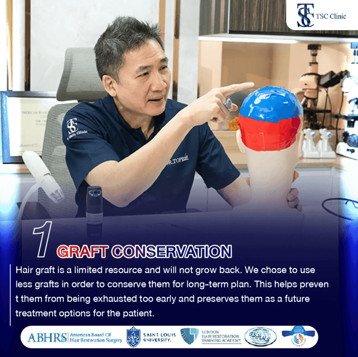 Because the number of hair grafts is limited—once they are used, they are gone forever and cannot regenerate—doctors must use grafts sparingly and with long-term planning. This is to prevent graft depletion too early and to preserve treatment options for the patient’s future. The area used for extracting hair follicle cells is called the Donor Area (the back of the scalp), which is not influenced by the hormones that cause hair loss. When hair follicle cells are transplanted to a new location,