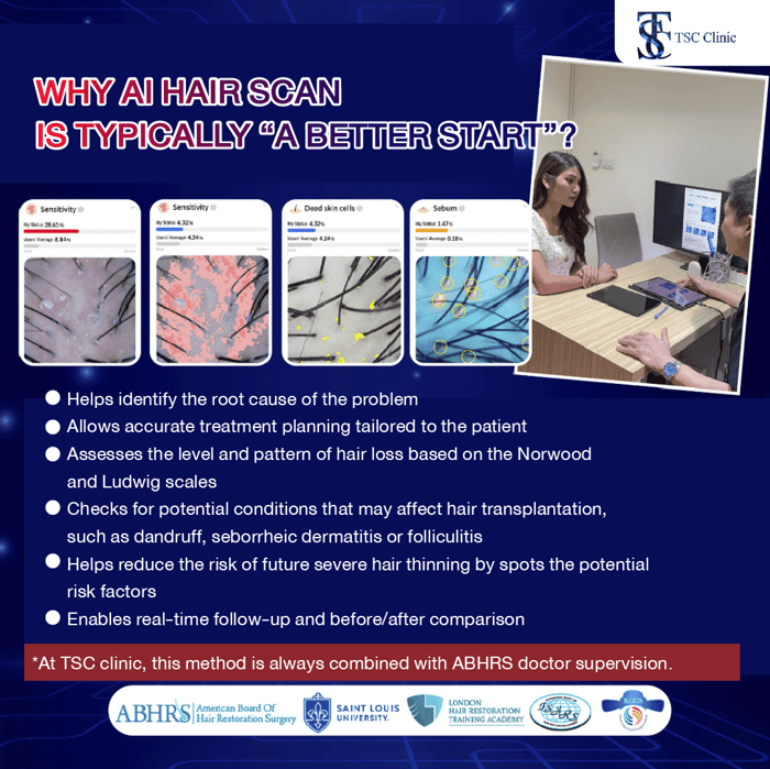 Therefore, an accurate diagnosis is more important than undergoing hair transplantation as quickly as possible. To achieve good results, treatment must begin with selecting the most appropriate approach for each individual. At THE SKIN CLINIC, we use AI Hair Scan technology to analyze the hair and scalp and identify the true underlying causes of the problem, allowing us to plan hair loss and hair thinning treatments accurately and effectively.