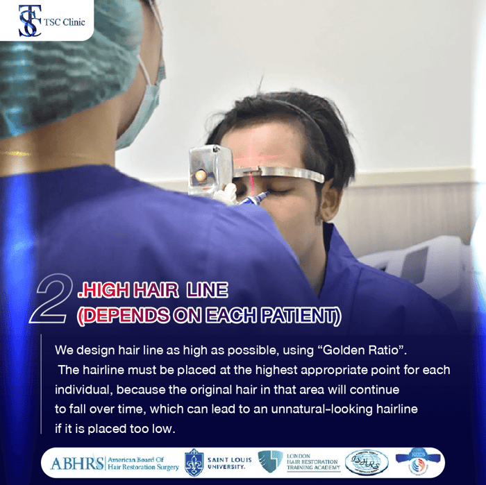 Doctors design the hairline based on the three-part facial proportion principle (Golden Ratio) and position it as high as appropriately suited to each individual patient, rather than as low as possible. This is because an excessively low hairline, as time passes and hair continues to fall out,
