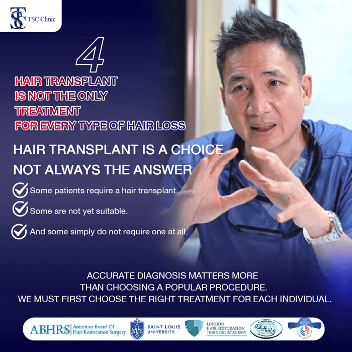Hair transplantation is one of the treatment options, not the complete solution. Certain types of hair thinning must first be treated at the root cause. Some cases are not yet suitable for hair transplantation, and some cases may not require hair transplantation at all, including conditions in which hair transplantation cannot be performed, such as: